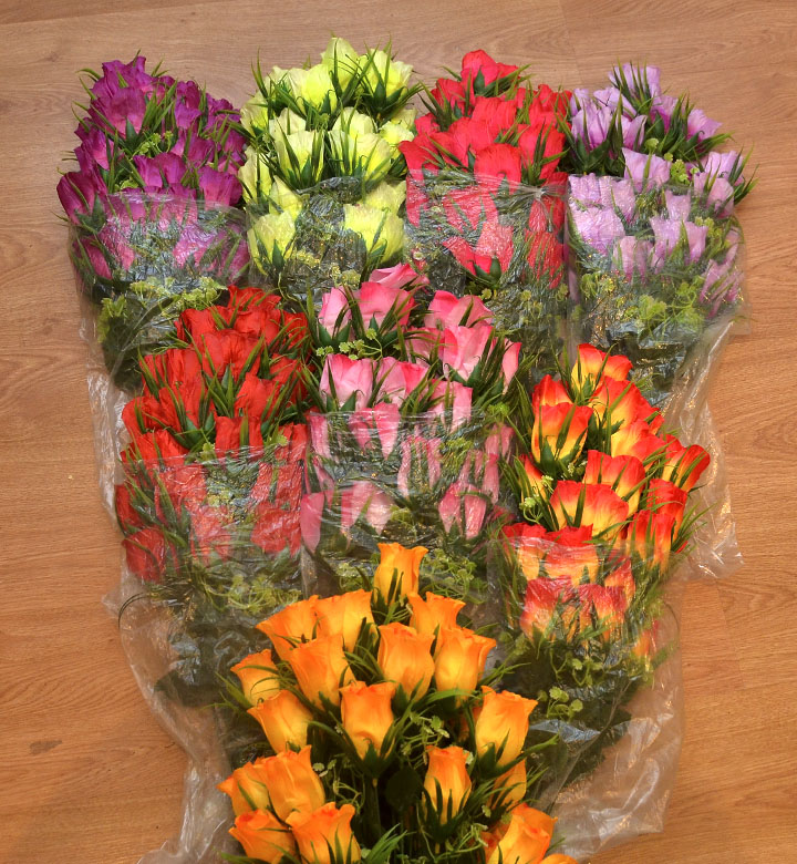 Троянди атласні в пластикових вусиках, букет 36 голов