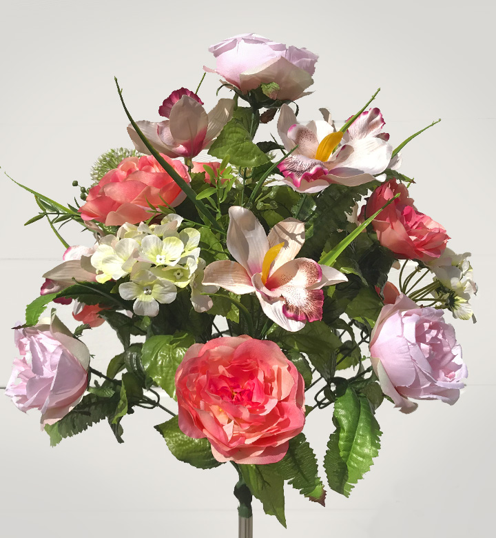 Троянди, орхідеї та гортензія с пластиковими шишками, букет 19 головок