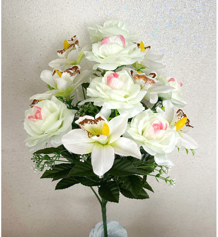 Атласні троянди з орхідеями, букет 14 головок